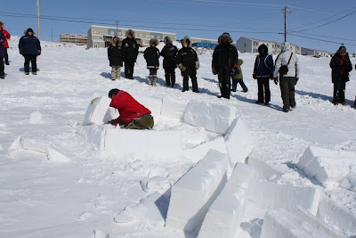 On Saturday in the afternoon there was an igloo building contest. I was really excited to see this done from start to finish. There ended up being three Inuit contestants that worked on their own, plus a group of white guys that made an interesting attempt. Apparently the Inuit man that usually wins every year and who holds the record of building an igloo in 30 minutes was not there this year, which made it a little more interesting for the younger guys. They were situated on the side of a hill, and at first I wasn't convinced that there was enough snow. But they had their saws ready and when they shoved them down into the snow they went in right up to the handles. It was amazing to me how they were able to cut out such solid blocks of snow… the snow here is so dry and compacted. So they dig there blocks out of what will later be the base of the igloo, and then begin placing the pieces one at a time around the edge. I always thought that they built several layers, but it is actually more of a spiral. They use a machete type knife throughout the process to shave off edges of the blocks so that they fit together well. It was really neat to watch, but it was SO COLD! I couldn’t believe our bad luck that the weather was so cold for Toonik Tyme weekend. After an hour and a half we just couldn’t take it anymore, so we returned to my truck to warm up and see what else was going on around town. We returned an hour later to see the fastest contestant just finish his igloo. Such a simple, beautiful structure. I haven’t seen this in person, but I have seen pictures of igloos lit up on the inside. The whole structure glows a delicate, icy blue – it is so pretty.